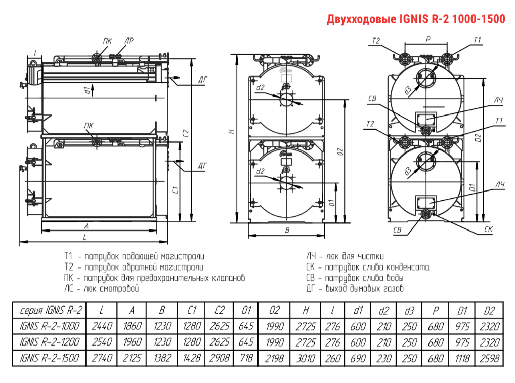 Технические характеристики модульного водогрейного трёхходового котла ARCUS IGNIS R-2-1000